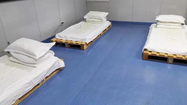 由于新冠病毒傳染性強、潛伏期長等特性,配送人員多次往返醫(yī)院等高危場所,接觸人員復雜,極易暴露,為節(jié)約時間,同時消除疫情擴散的潛在隱患,值班人員把公司培訓室改成臨時臥室,兩張木質托盤一拼就成了他們的床,當我們還沉睡在被窩里時,他們已經(jīng)在送貨的路上。